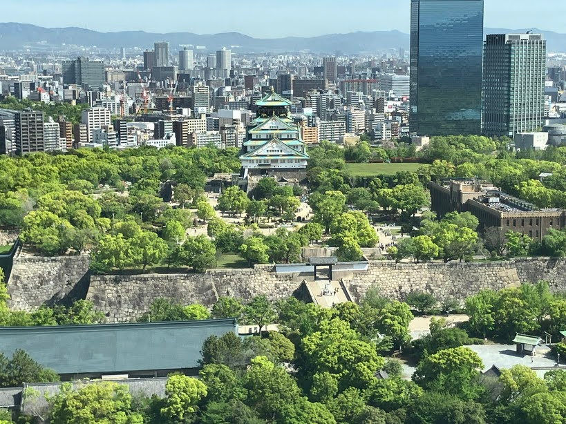 パティーナ大阪は大阪城と難波宮跡という2つの歴史遺産の間に位置していて、緑に包まれた静寂の中、大阪城が時を超えて現出していた。